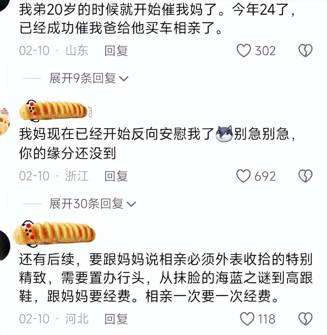 網友A表示:他的弟弟從20歲的時候就開始催媽媽幫他安排相親了,現在24歲,成功催到他爸給買了一輛車相親。
