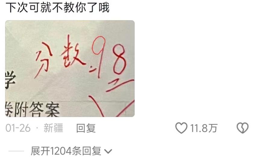 網友將18分,P成了98分,然後像哄孩子一樣哄着說:“下次可就不教你了哦!”