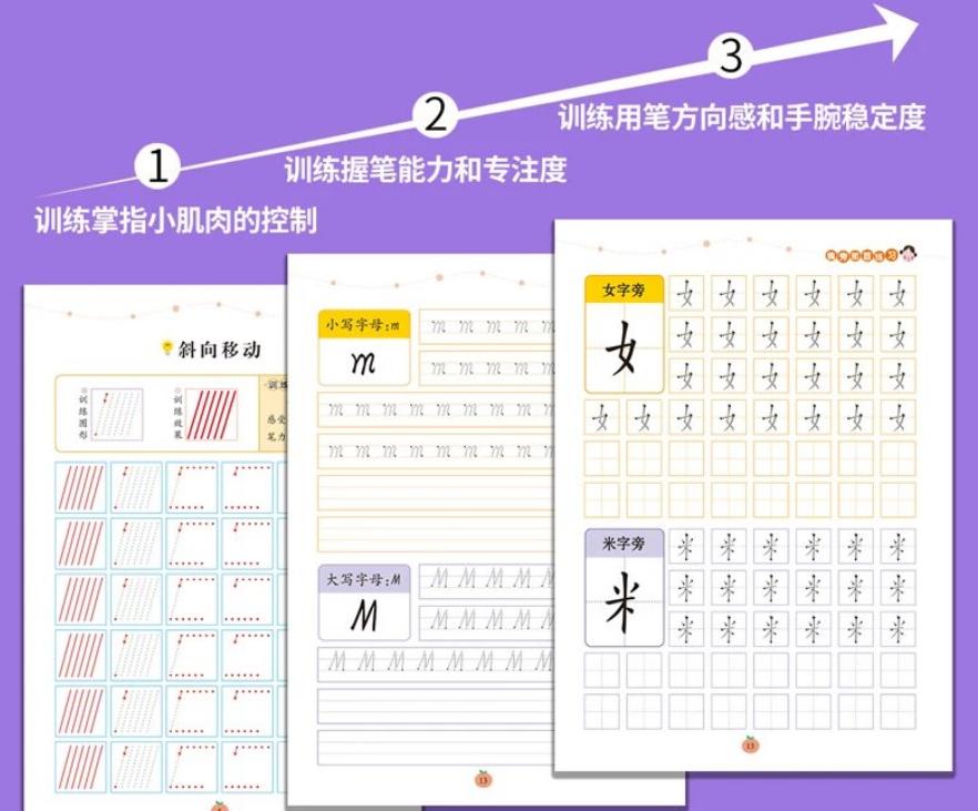 這10冊練習冊,便是用“線條-數字-拼音-英語-筆畫筆順-偏旁部首-漢字”這樣的順序,循序漸進地帶孩子練出一手好字。