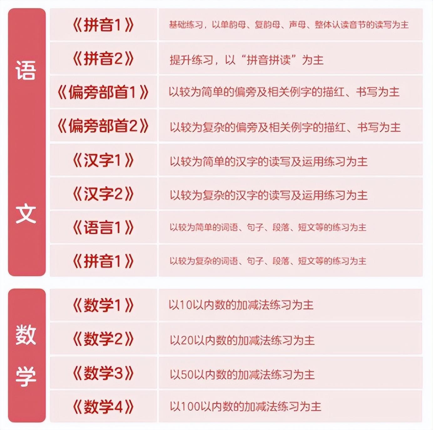 理由二:這套書一共有12本,分別包括2本拼音、2本偏旁部首、2本漢字、2本語言、4本數學,內容是根據《小學課程標準》進行編寫的,比較全面,銜接也比較緊密,可以實現平穩過渡;