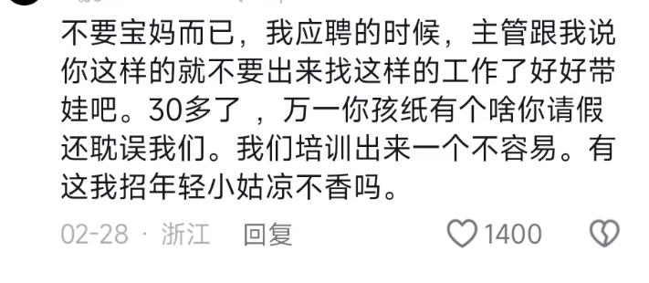 相比於“年輕、事兒少、愛學習”的小年輕來說,用人單位自然不願意要“年紀大、事兒多、思維固定”的寶媽了。