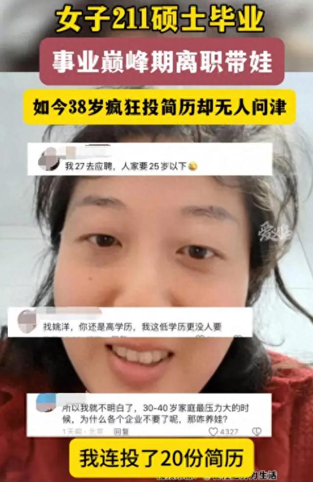 現在,孩子長大了,寶媽想要繼續出來工作,只是,這時候已經38歲,且全職這麼多年的她,即便擁有“211碩士畢業”這個頭銜,在求職這件事情上,依舊屢屢碰壁。