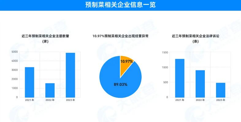 不只是這“梅菜扣肉”,如果去天眼查APP上看,可以看到我國目前有6.4萬家預製菜相關的企業,其中,有9.24%的相關企業,曾出現過法律訴訟,10.97%的相關企業,曾出現過經營異常,還有4.55%的企業,曾出現過行政處罰。