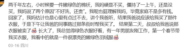 事情很簡單,就是小時候想要一件嫩綠色的棉襖,但是媽媽因爲貴沒給買,爸爸想給買再去已經沒有了。