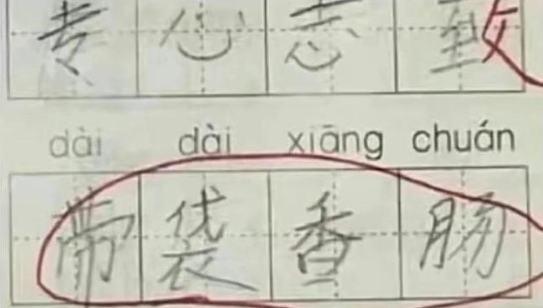 這孩子寫成了“帶袋香腸”?