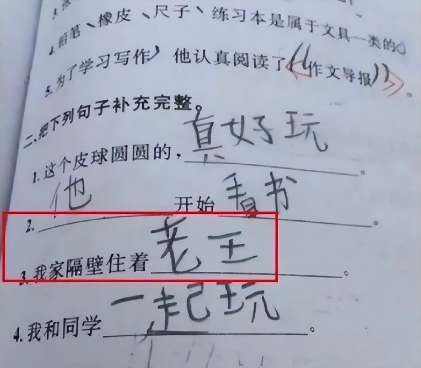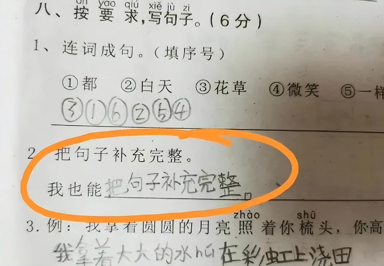 好傢伙,孩子看到題目是“把句子補充完整”,直接寫成了“我也能把句子補充完整”。