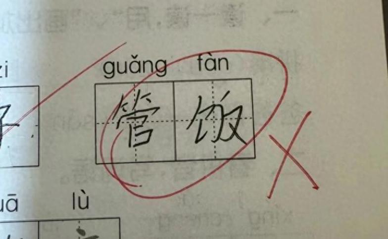 拼音是guǎng fàn,應該是“廣泛”,但是孩子估計看錯了前後鼻音,寫成了“管飯”。