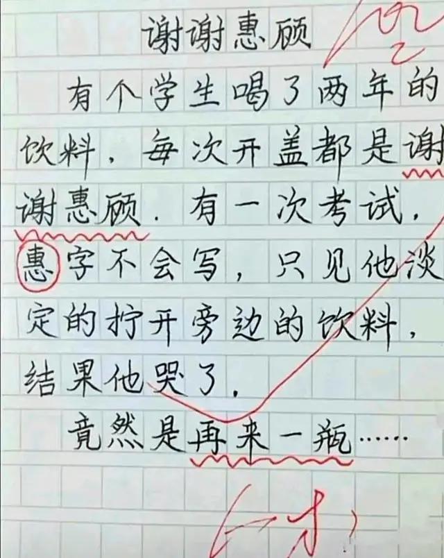 學生喝了兩年的影響,每次開開都是“謝謝惠顧”。有一次考試,“惠”不會寫,打開旁邊的飲料,結果他哭了,竟然是“再來一瓶”。