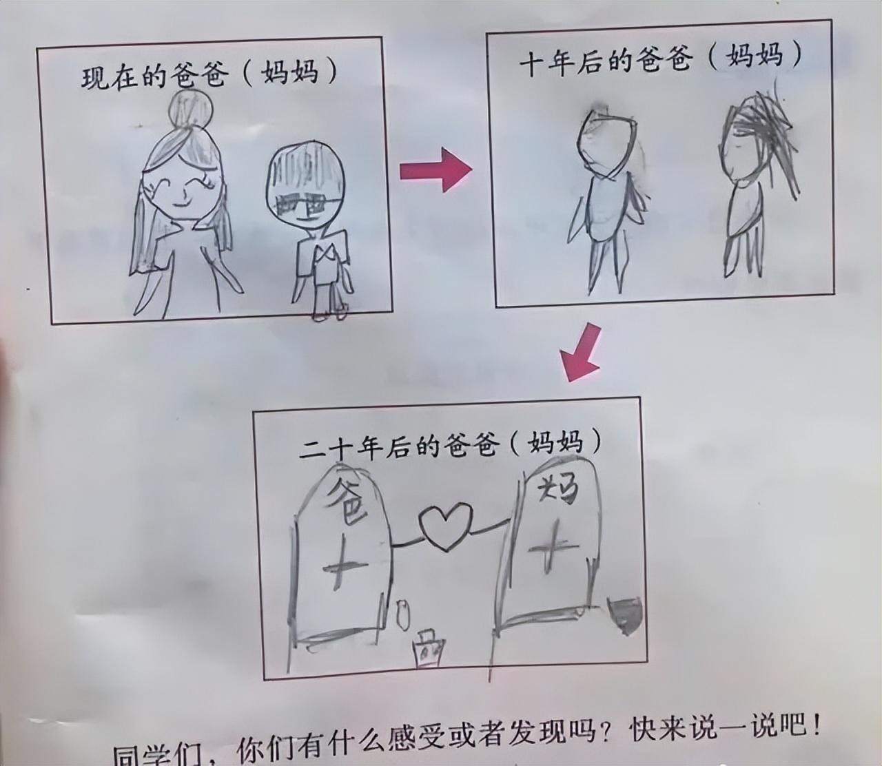這不,題目讓孩子畫出現在、10年後、20年後的爸爸媽媽。