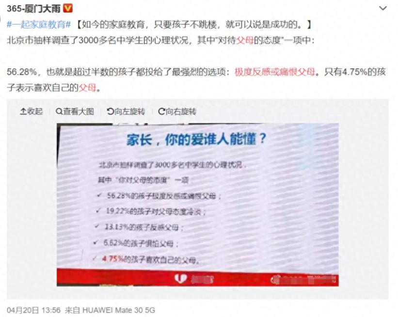 調查的結果很扎心,那就是:有56.28%的學生,對自己的父母很是反感、痛恨。