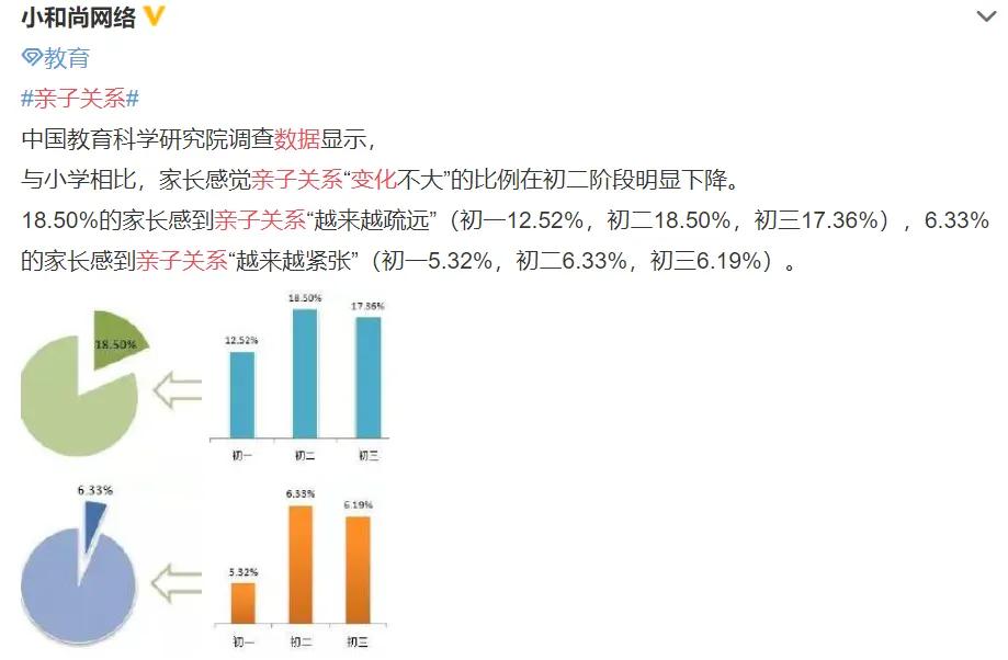 中國教育科學研究院就親子關係曾做到調查,發現家長感覺“親子關係越來越疏遠”在初二開始,佔比越來越高。