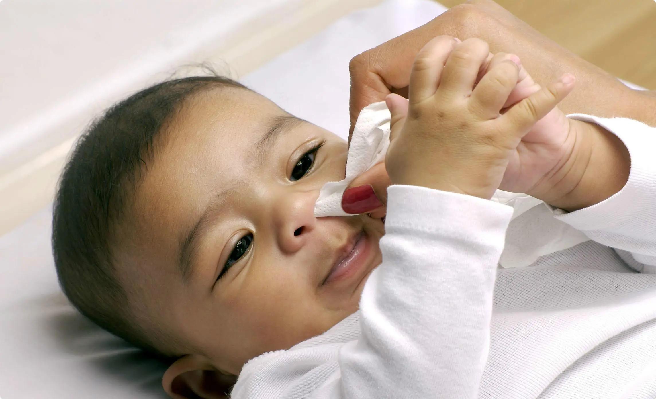 一般情況下,只需要用熱毛巾在寶寶鼻根處熱敷一下,等鼻屎溼潤之後,再用衛生紙、棉籤清理出來即可。