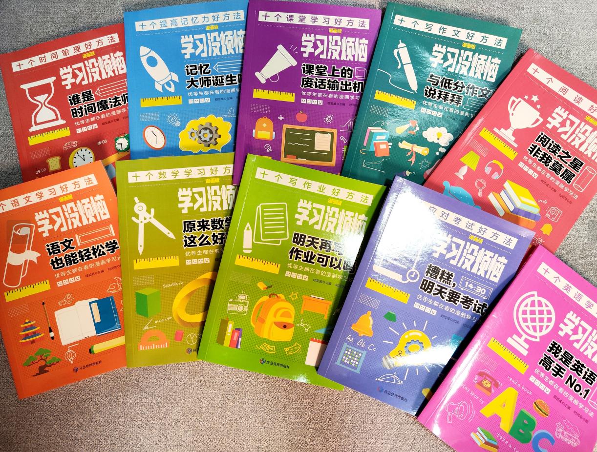 這套書一共有10冊,每一本都是一個主題,分別是:英語、寫作文、語文、閱讀、時間、數學、考試、記憶力、課堂學習、寫作業。