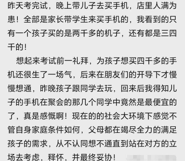 網友原本還爲孩子想買4千多的手機生氣,後來發現,孩子的手機竟然是聚會那幾個同學中最便宜的,不禁感慨萬分!