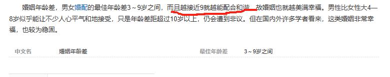 在百科中就有寫,男女婚配的最佳年齡差是3-9歲之間,而且越接近9,就越能配合和諧。