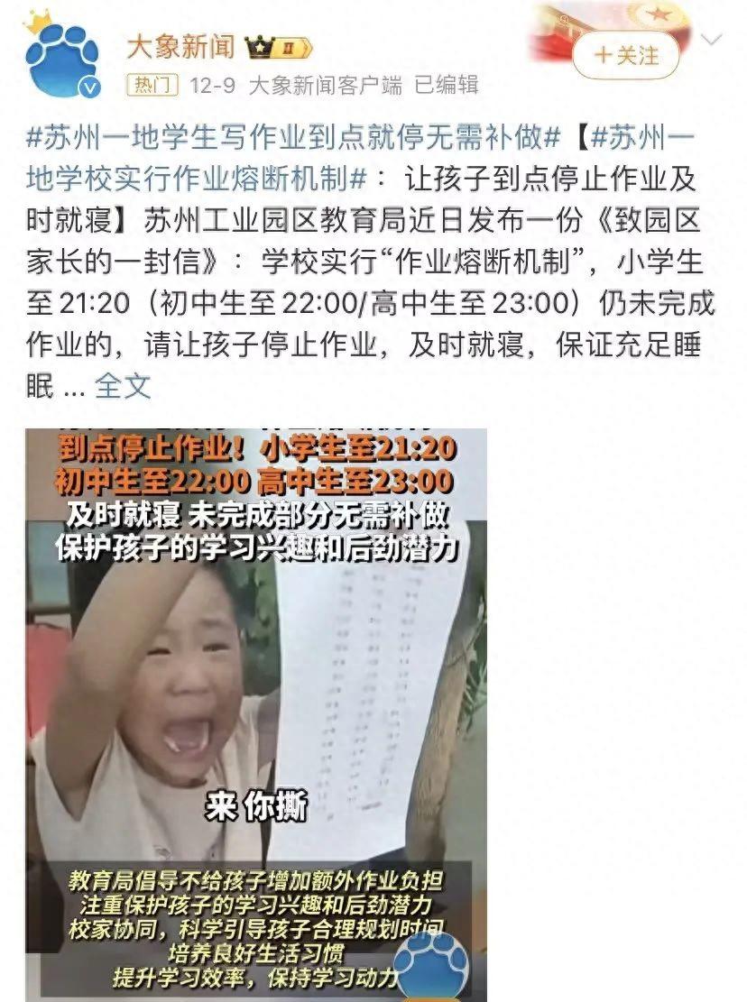 最近的家長羣被一個新聞炸開了:蘇州一地學生寫作業到點就停無需補做!據說還有不少地區的學校,也已經開始試行作業熔斷機制。(小學生到 9:20,初中生到 10:00,高中生到 11:00)