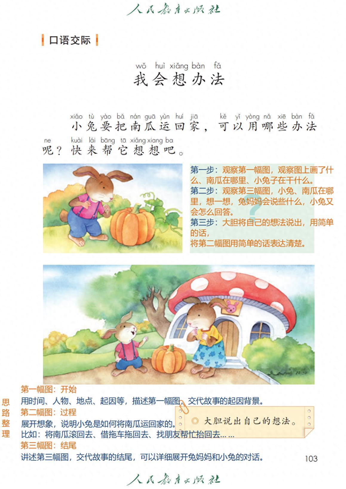 對於這篇《我會想辦法》來說,需要做的是觀察第一幅圖和第三幅圖,然後將第二幅圖補充完整,思考一下,小兔是如何將南瓜運回家的。