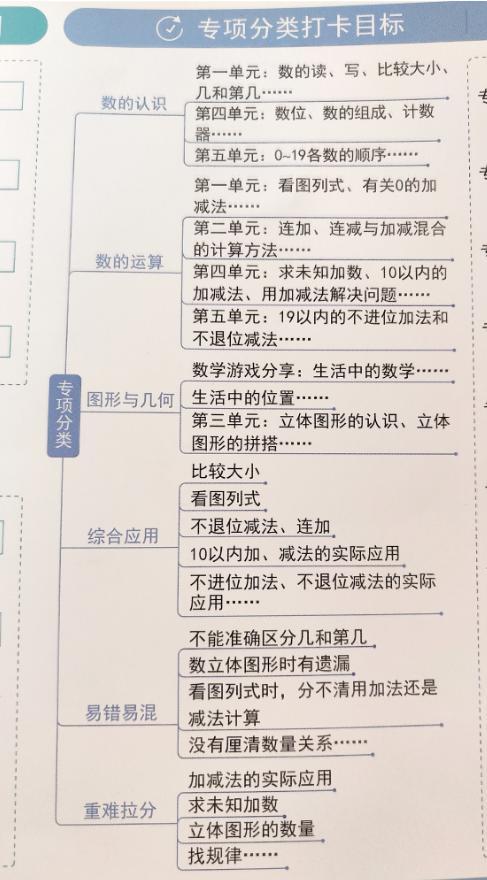 一年級的專項分類學習,其實也不簡單,蘇教版的主要包括了數的認識、數的運算、圖形與幾何、綜合應用、易錯易混、重難拉分。