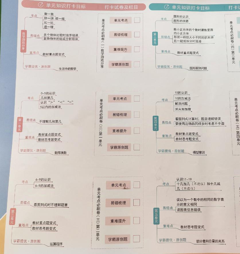 一年級上冊數學的單元複習,主要便是以單元爲單位,帶孩子過一下這個單元的考點、易錯點、重難點等,是否掌握。