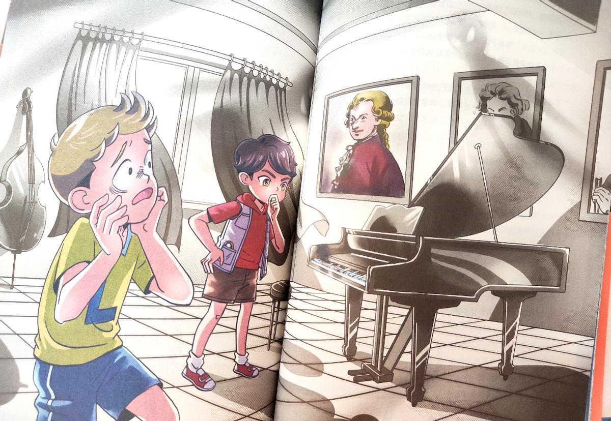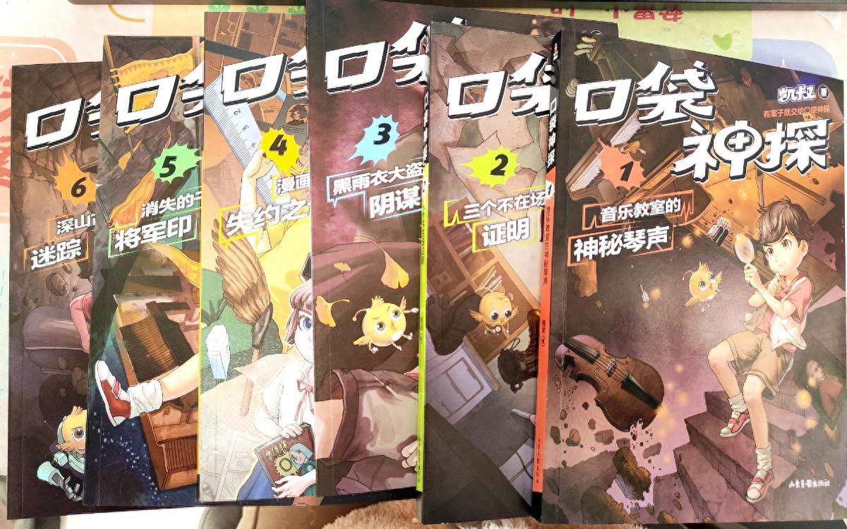這一套《口袋神探》一共有6本,每一本都有一個偵探主題,分別是音樂教室的神祕琴聲、三個不在場證明、黑雨衣大盜的陰謀、漫畫家失約之謎、消失的千年將軍印、深山古墓迷蹤。