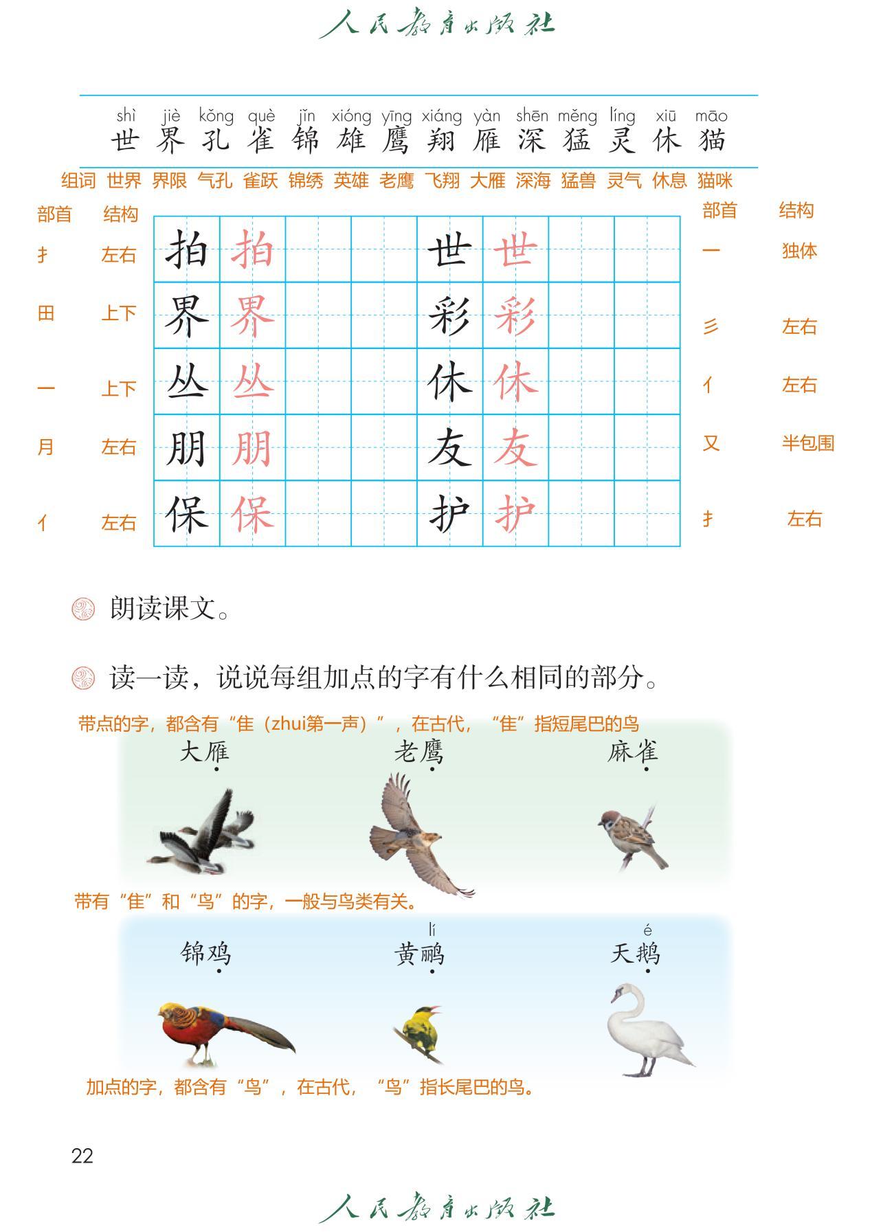 文中的“雁、鷹、雀”都有“隹”,大多含有部件“隹”的字,都和鳥類有關係,這樣的字還有雕、雛等。