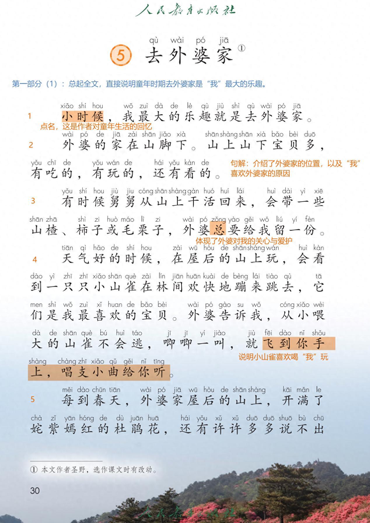 《去外婆家》這篇課文,一共有6個自然段落,可做好標記。