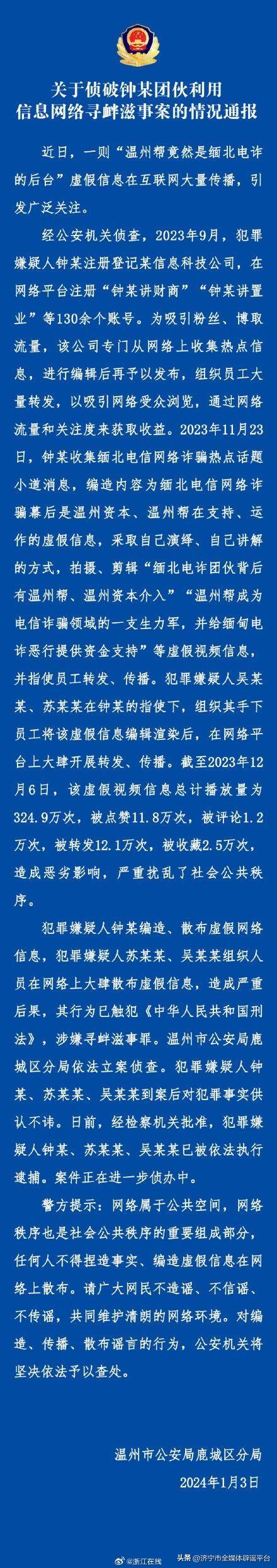 1月3日上午,作爲2024年全國公安機關打擊整治網絡謠言專項行動首個逮捕3人的案件,溫州市公安局通報了一則利用信息網絡尋釁滋事案件。