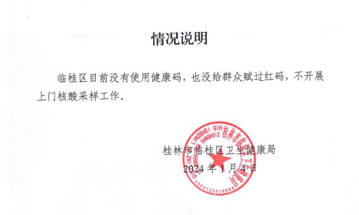 對此,桂林市臨桂區衛生健康局發佈情況說明:臨桂區目前沒有使用健康碼,也沒給羣衆賦過紅碼,不開展上門核酸採樣工作。