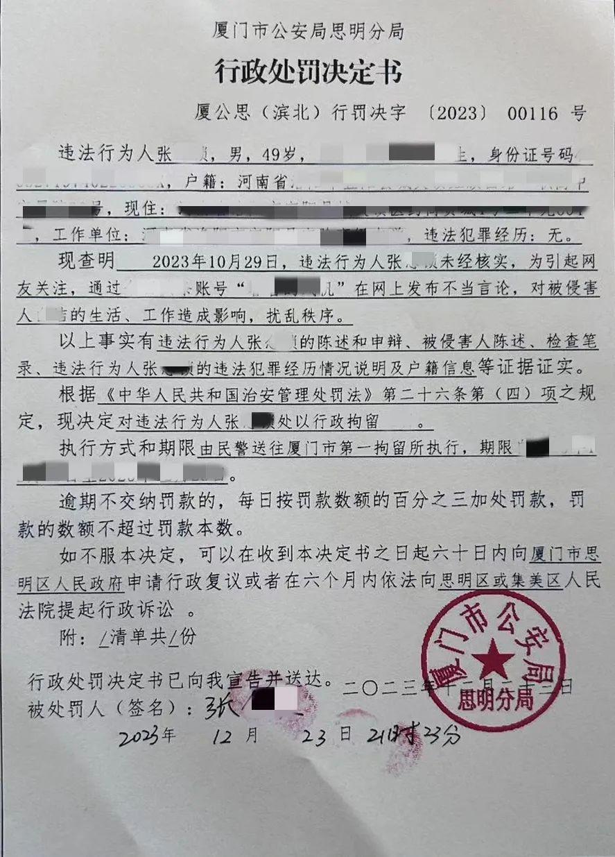 張某,男,編造散佈謠言!廈門警方依法處以行政拘留