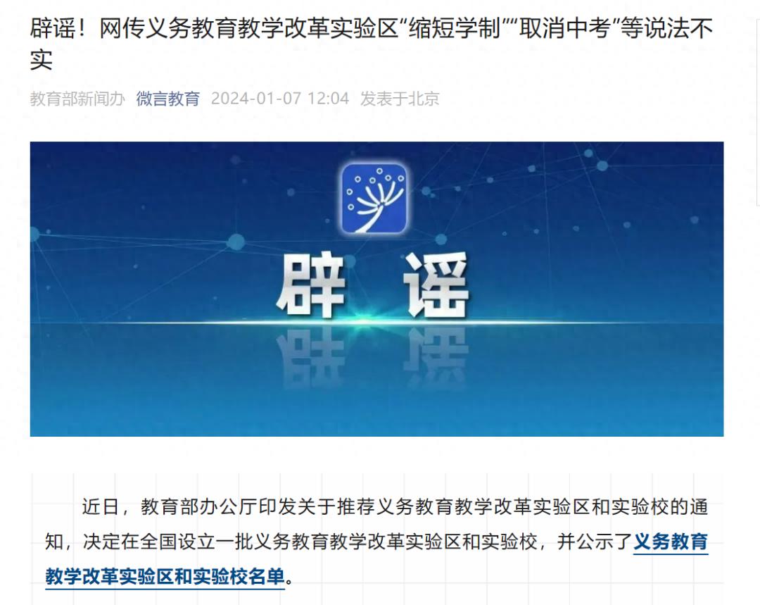 義務教育教學改革實驗區將縮短學制、取消中考?教育部闢謠