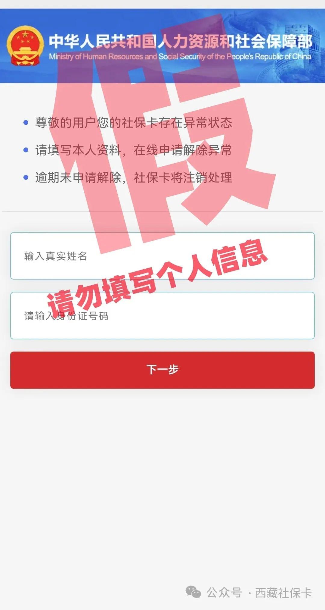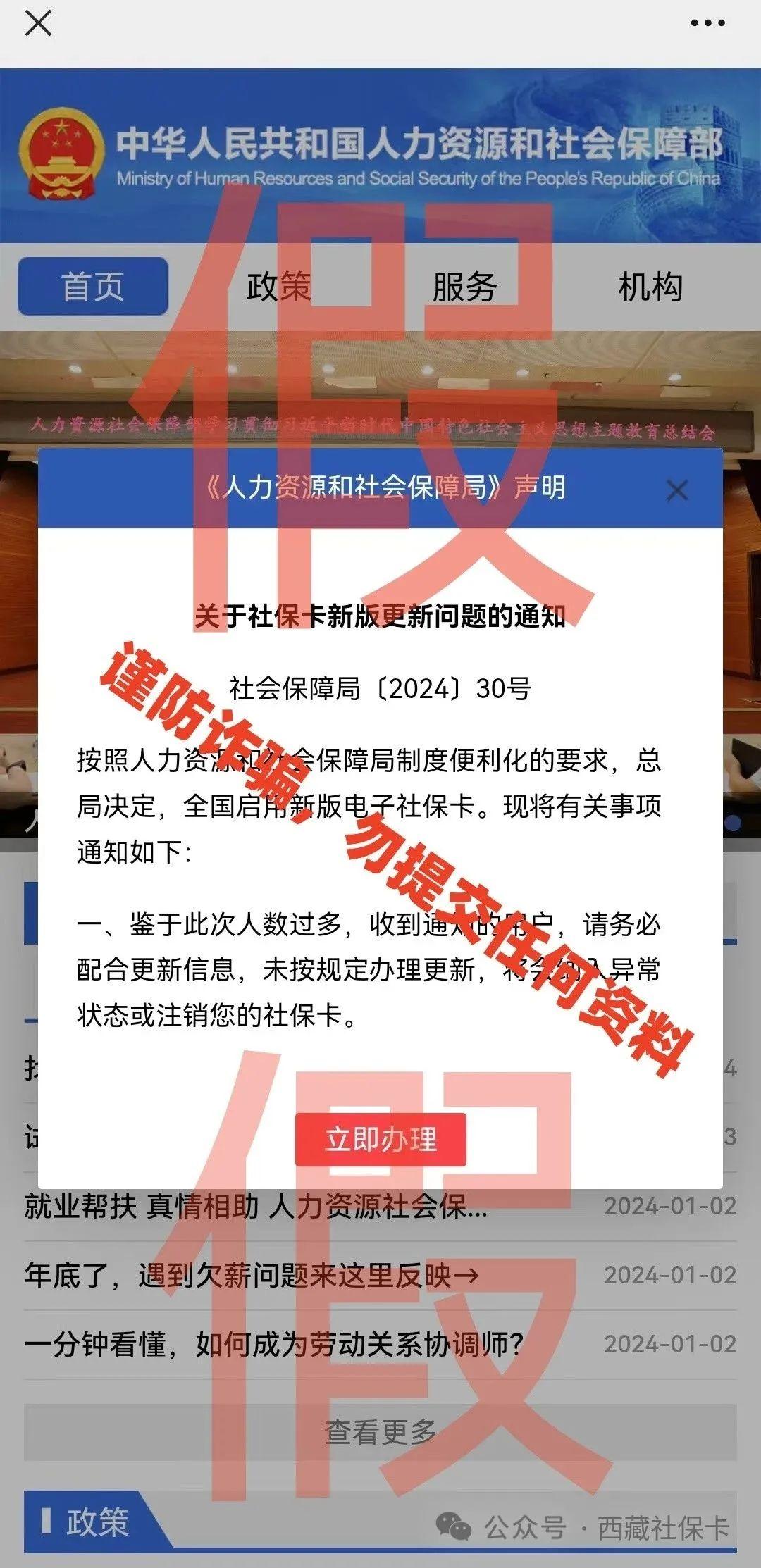 點擊鏈接跳轉到的頁面與人力資源社會保障部官方網站的界面非常相似,但實際爲不法分子僞造的詐騙網站。如果按詐騙網站頁面上的提示填寫姓名、身份證號、銀行卡號等信息,則可能導致社保卡被盜刷,請大家注意甄別!!!
