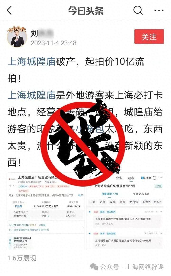一、依法查處劉某編造“城隍廟破產”網絡謠言。2023年11月4日,上海劉某在網絡上看到一篇“城隍廟一地產項目破產”的報道後,爲博眼球,以斷章取義的方式在“今日頭條”平臺上編造“上海城隍廟破產,起拍價10億流拍”“上海城隍廟經營不善,破產重組”等不實信息。引發網民關注討論,並造成惡劣影響。目前,劉某被上海警方依法處以行政拘留5日。