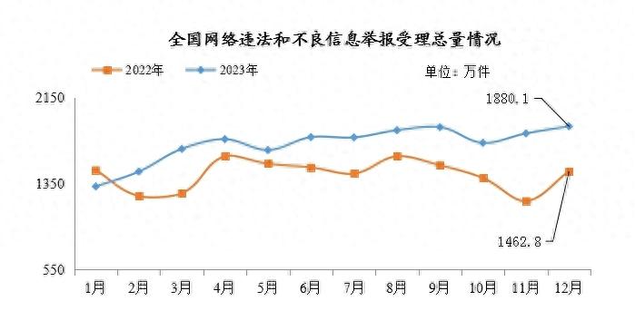 2023年12月全國受理網絡違法和不良信息舉報1880.1萬件