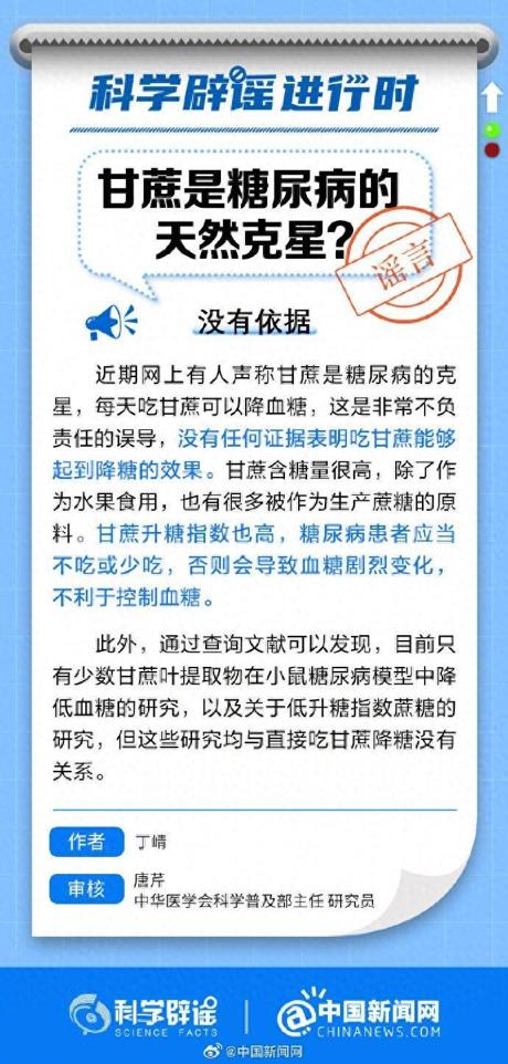 有人聲稱“甘蔗是糖尿病的剋星,每天喫甘蔗可以降血糖”,這是非常不負責任的誤導,沒有任何證據表明喫甘蔗能夠起到降糖的效果。甘蔗含糖量很高,升糖指數也高,糖尿病患者應當不喫或少喫,否則會導致血糖劇烈變化,不利於控制血糖。