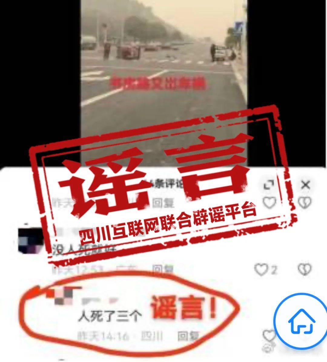 1月16日,網民鄒某某在一車禍視頻下評論留言稱死了3個人。經覈實,視頻中交通事故發生在德陽市中江縣,系摩托車與電三輪相撞,造成雙方駕駛員受輕微傷,並未造成人員死亡。鄒某某所發言論系謠言。