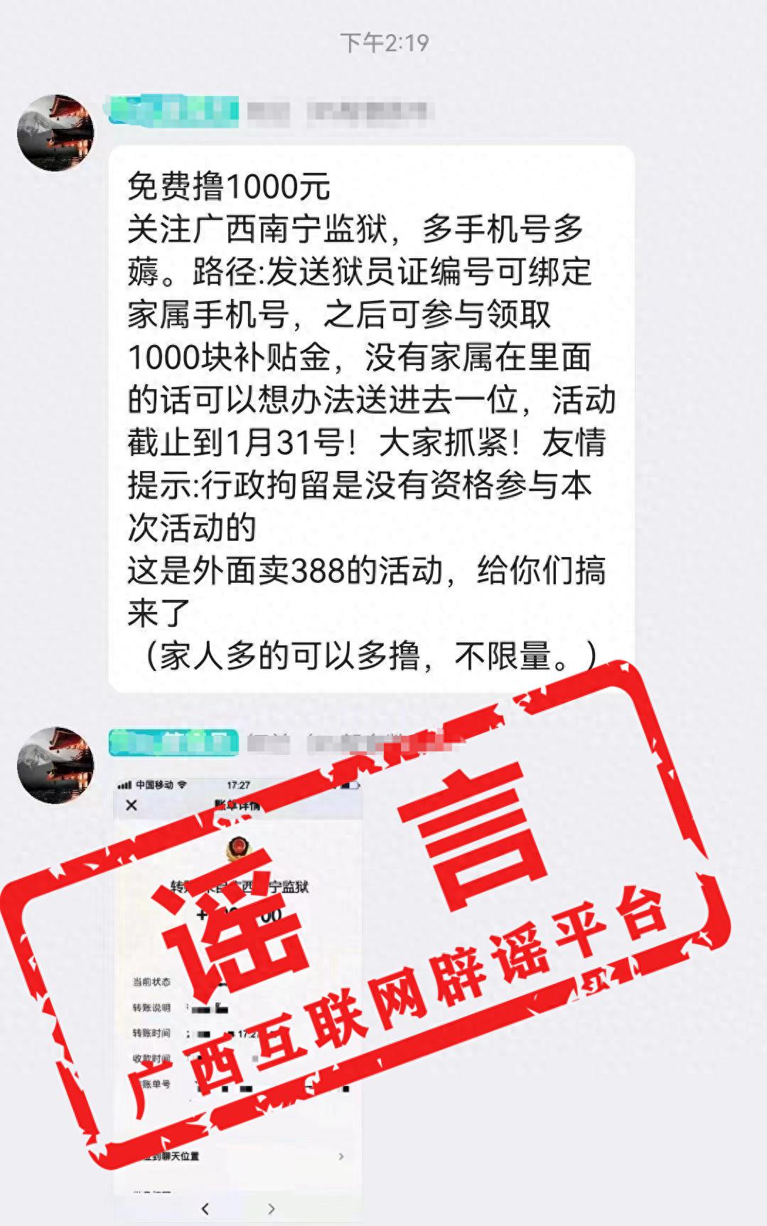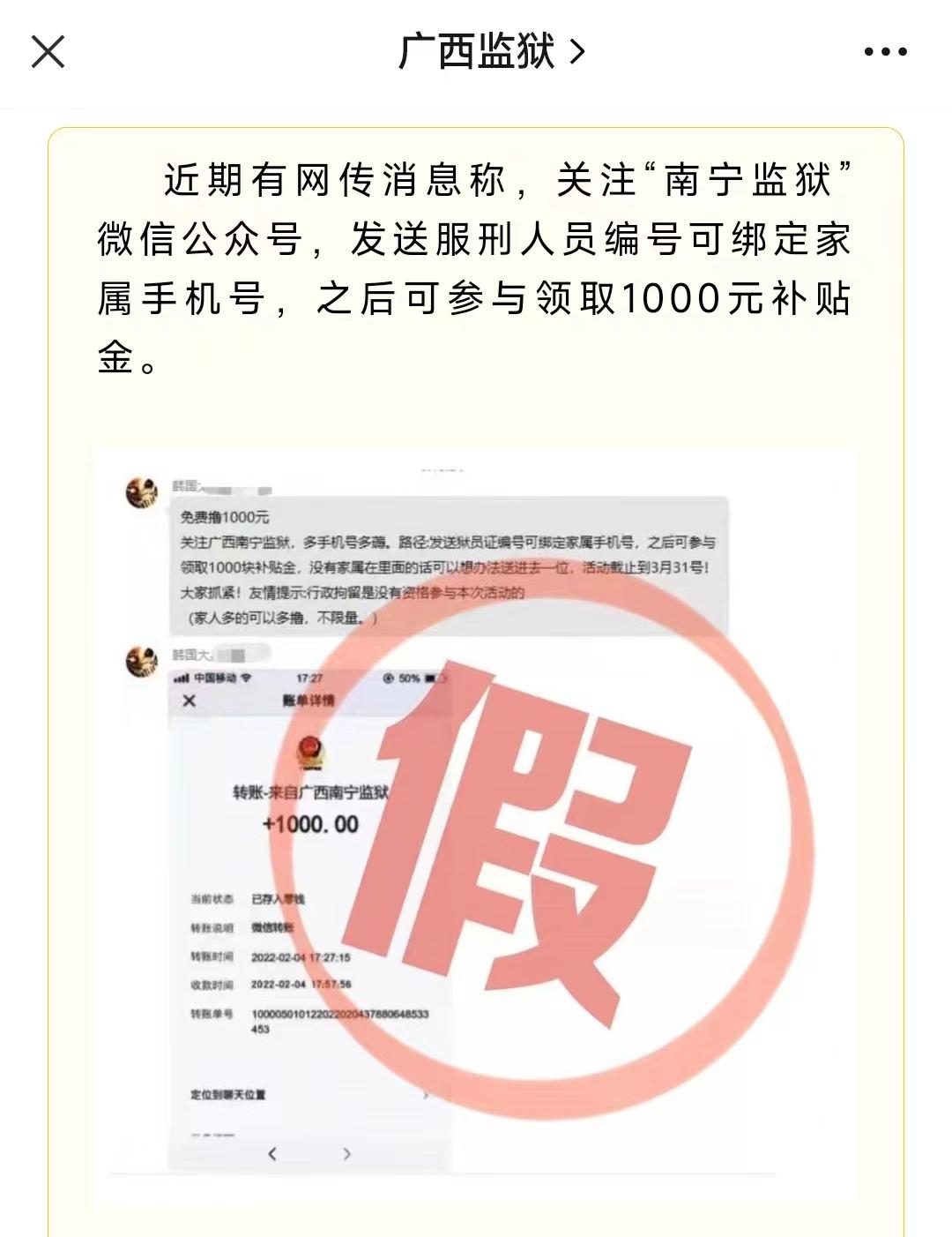 近日,有網民在社交軟件聊天羣中收到“關注‘南寧監獄’微信公衆號,發送服刑人員編號可綁定家屬手機號,之後可參與領取1000元補貼金”的消息。