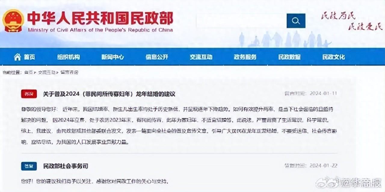 網友表示,“因2024年立春,處於農曆2023年末,有民間傳言,此年爲‘寡婦年’,不適宜結婚等。此說法,嚴重背離了生活常識和科學常識。” 網友建議,由民政部或其他部委聯合發文,發表一篇面向全社會的普及宣傳文章。引導廣大居民在龍年正常結婚,不要受迷信、社會傳言影響,應結盡結,爲我國的人口發展事業貢獻力量。