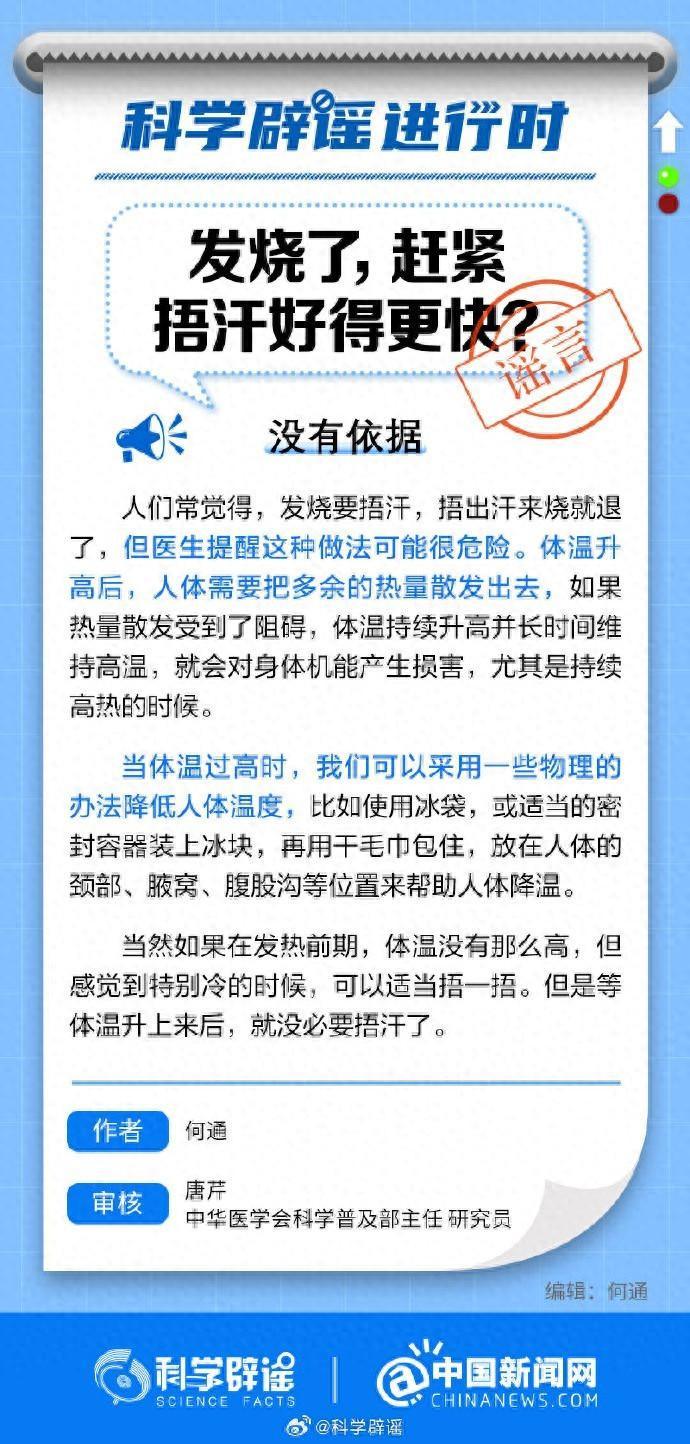 出汗來燒就退了,但醫生提醒這種做法可能很危險。體溫升高後,人體需要把多餘的熱量散發出去,如果熱量散發受到了阻礙,體溫持續升高並長時間維持高溫,就會對身體機能產生損害,尤其是持續高熱的時候。當體溫過高時,我們可以採用一些物理的辦法降低人體溫度,比如使用冰袋,或適當的密封容器裝上冰塊,再用乾毛巾包住,放在人體的頸部、腋窩、腹股溝等位置來幫助人體降溫。