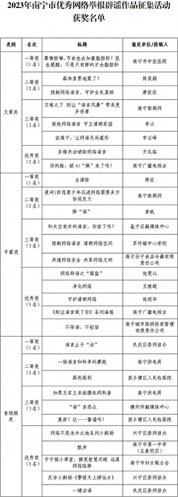 2023年南寧市優秀網絡舉報闢謠作品徵集評選活動獲獎名單公示