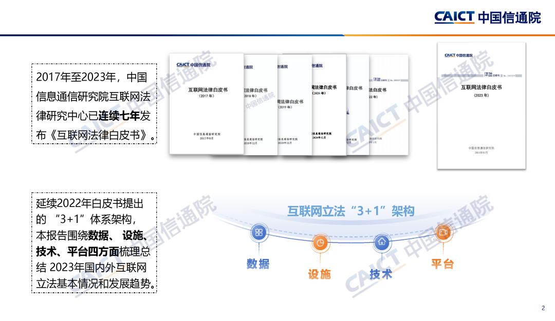 中國信通院持續跟蹤研究國內外互聯網法治最新動向和發展趨勢,連續七年發佈《互聯網法律白皮書》。《互聯網法律白皮書(2023年)》系統梳理過去一年國內外重要互聯網立法活動,深入分析我國互聯網立法的最新成果和國際互聯網立法進展,對未來互聯網立法工作進行了展望,希望能爲社會各界瞭解互聯網領域立法情況提供有價值的參考。