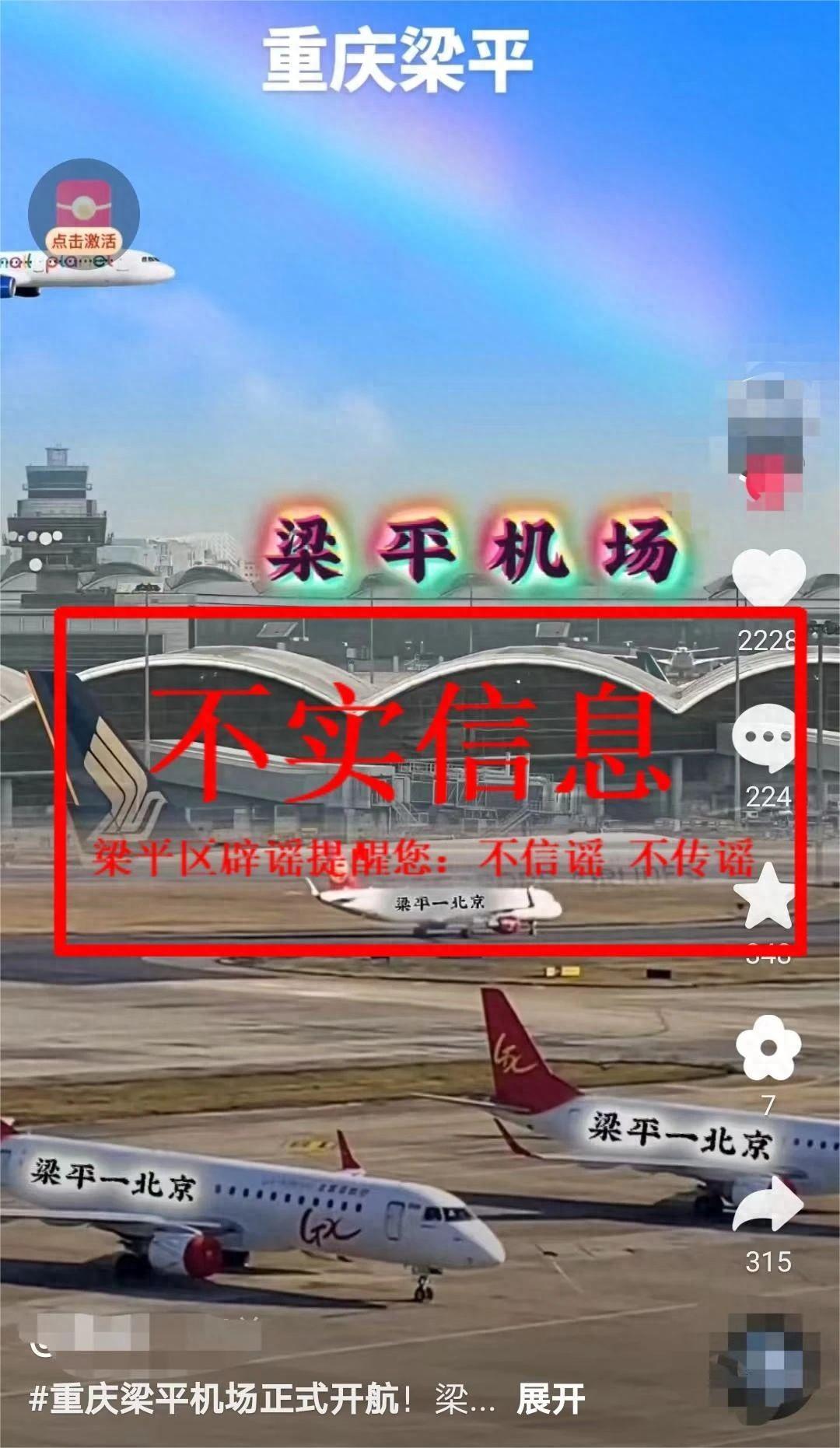近日,一則短視頻消息稱重慶梁平機場正式開航,視頻顯示“梁平—北京”航線的飛機,引發網友關注。經梁平區相關部門覈實,梁平機場已開通梁平⇌黔江,梁平⇌武隆短途運輸航線,目前暫未開通梁平—北京的航線,該信息爲不實信息。