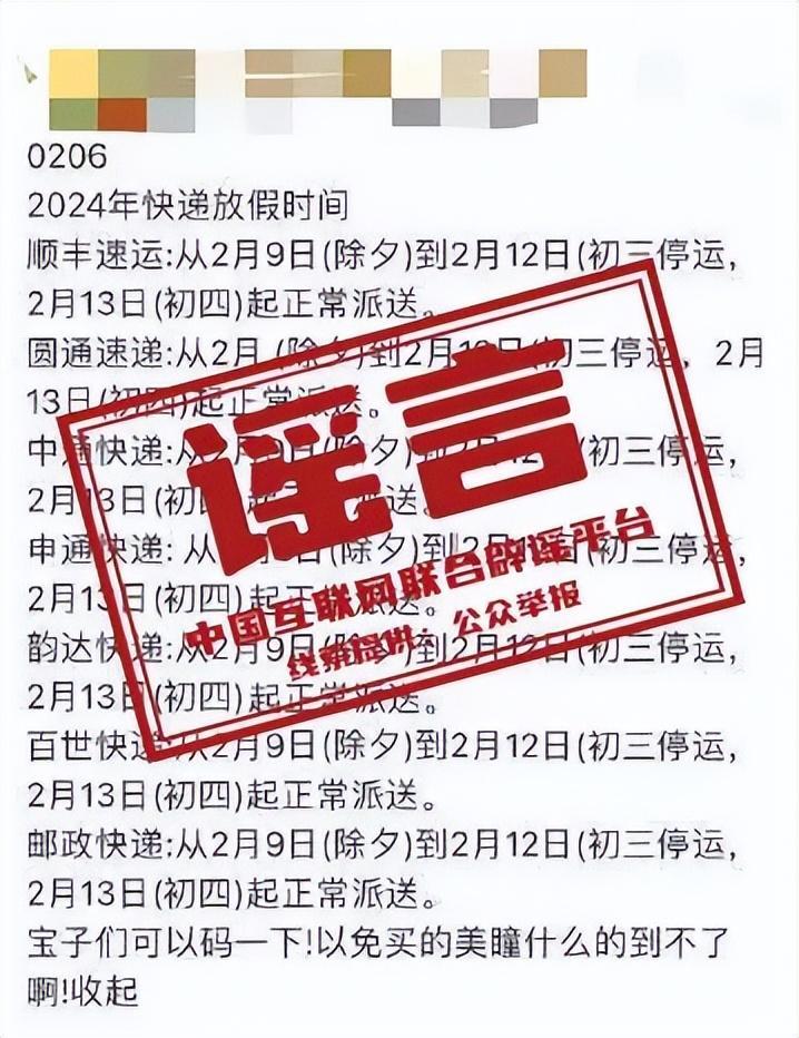 真相:近日,有賬號發文曬出快遞公司2024年春節期間放假時間,其中包括順豐、圓通、中通、申通、韻達、百世、郵政等多家快遞公司,引發關注。對此,1月31日,順豐集團官方微博發文稱,“今年北至漠河,南至三沙,各地順豐的站點都將在春節期間持續提供寄遞服務。”2月1日,中國郵政官方微博發佈《2024年春節服務公告》,明確表示“我們春節不打烊”,2月10日至17日將持續提供全覆蓋、不停休的服務。此外,有媒體向網傳圖中提到的快遞公司進行求證,相應快遞公司均予以否認。但需要注意的是,春節期間快遞量大,可能會出現延遲派送的情況。因此,建議提前安排好寄送計劃,合理規劃時間。(來源:“九派新聞”微信公衆號)