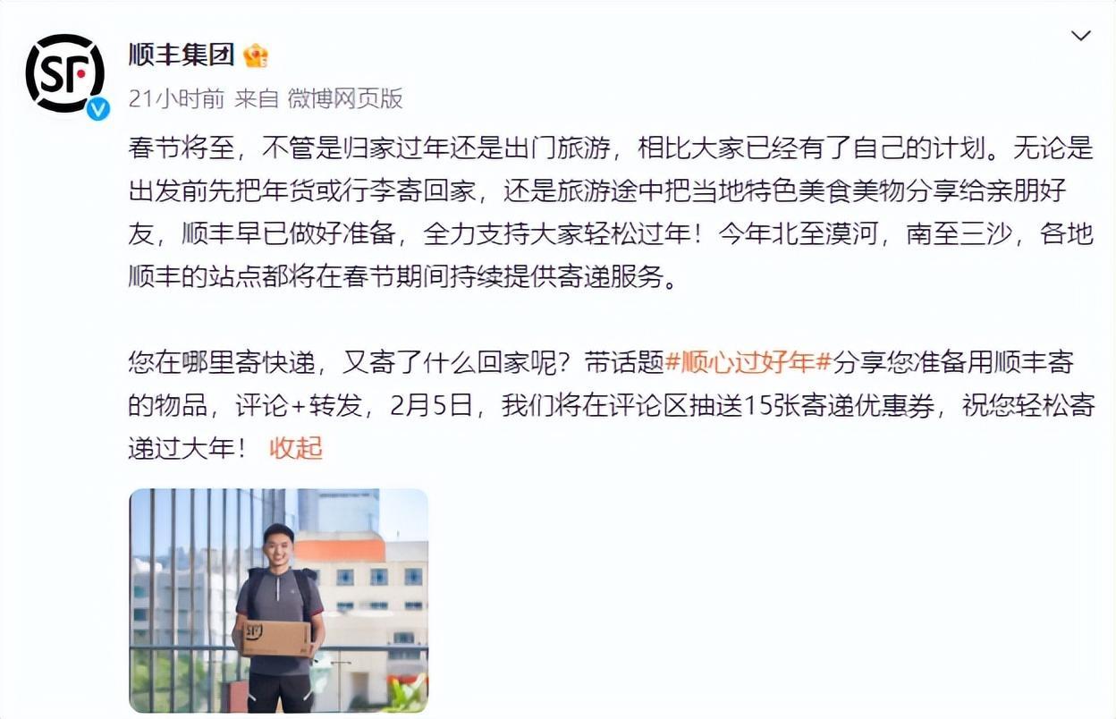 1月31日,順豐集團官方微博發文稱,“今年北至漠河,南至三沙,各地順豐的站點都將在春節期間持續提供寄遞服務。”