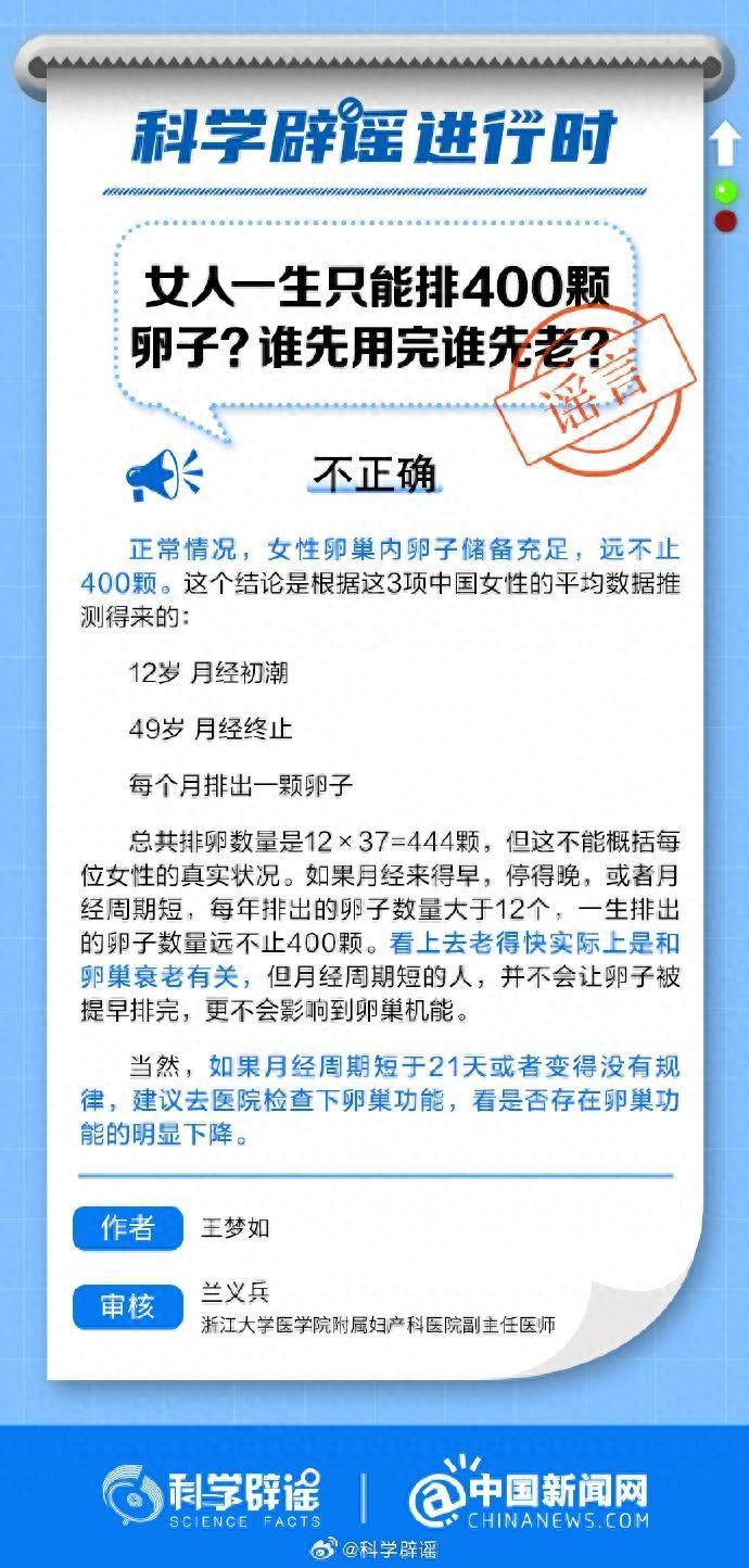 正常情況下,女性卵巢內卵子儲備充足,一生遠不止400顆。看上去老得快實際上是和卵巢衰老有關,月經週期短的人,並不會讓卵子被提早排完,更不會影響到卵巢機能。