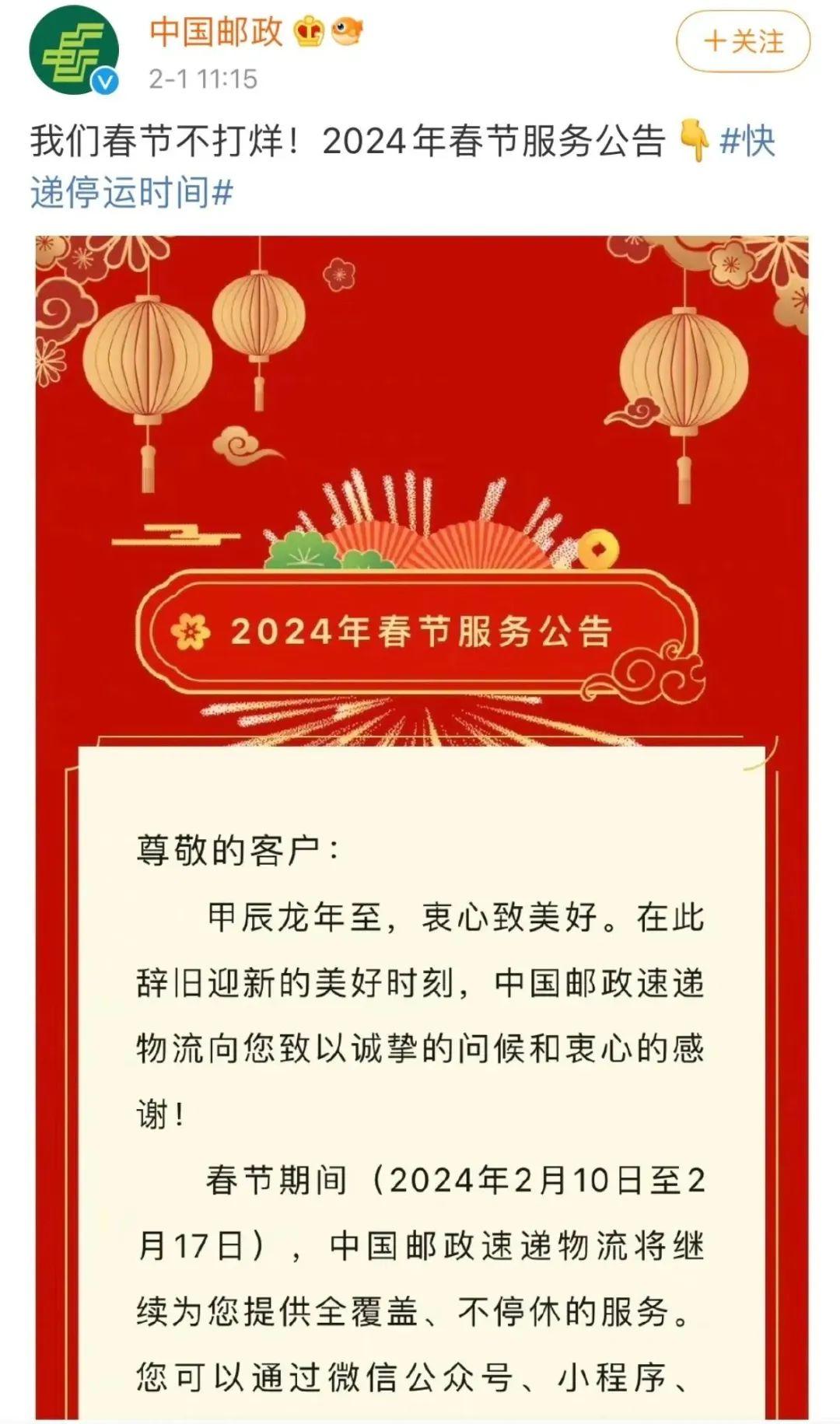 2月1日,“中國郵政”官方微博發文,春節期間(2月10日至2月17日),中國郵政速遞物流將繼續提供全覆蓋、不停休的服務。春節期間郵件時限可能延長。部分區域將加收資源調節費,收費標準詳詢當地網點或工作人員。