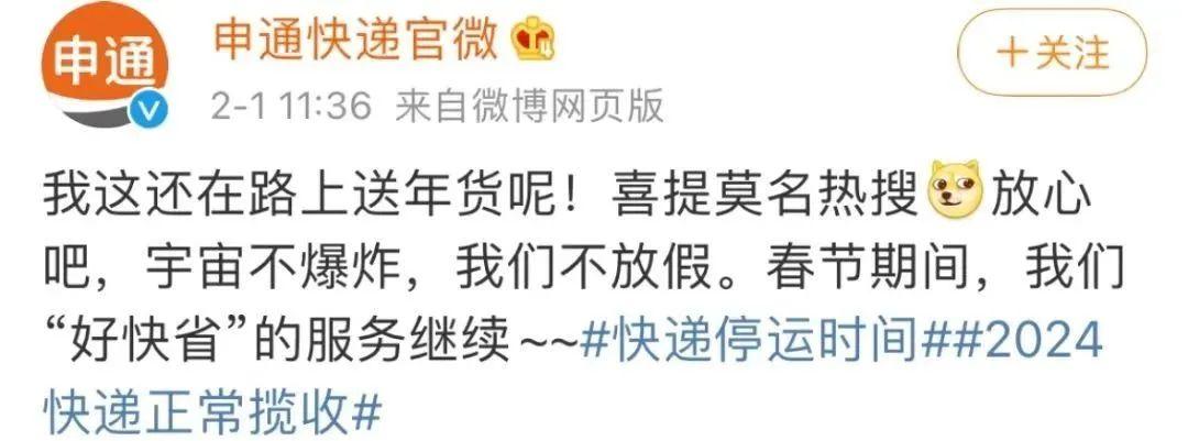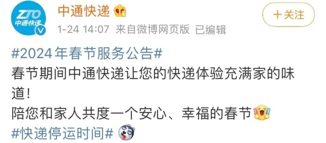 近日,有賬號發文曬出快遞公司2024年春節期間放假時間,話題#快遞停運時間#衝上熱搜第一,其中包括順豐、圓通、中通、申通、韻達、百世、郵政等多家快遞公司。