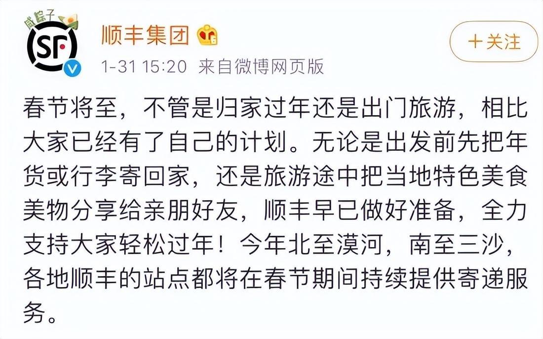1月31日,“順豐集團”官方微博發文,今年北至漠河,南至三沙,各地順豐的站點都將在春節期間持續提供寄遞服務。