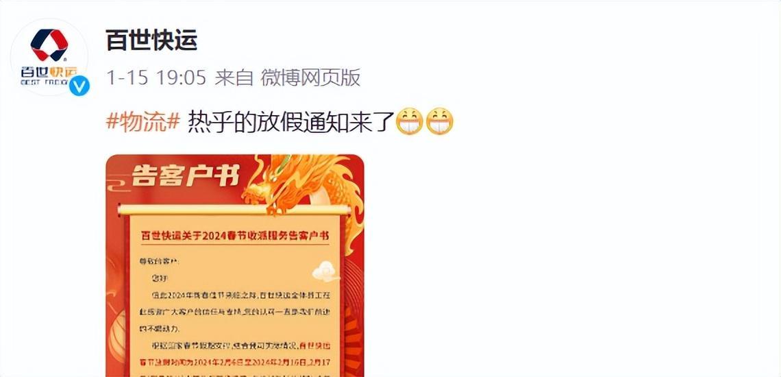1月15日,“百世快運”官方微博發文表示,百世快運春節放假時間爲2024年2月6日至2024年2月16日,2月17日(正月初八)全網恢復正常運營。