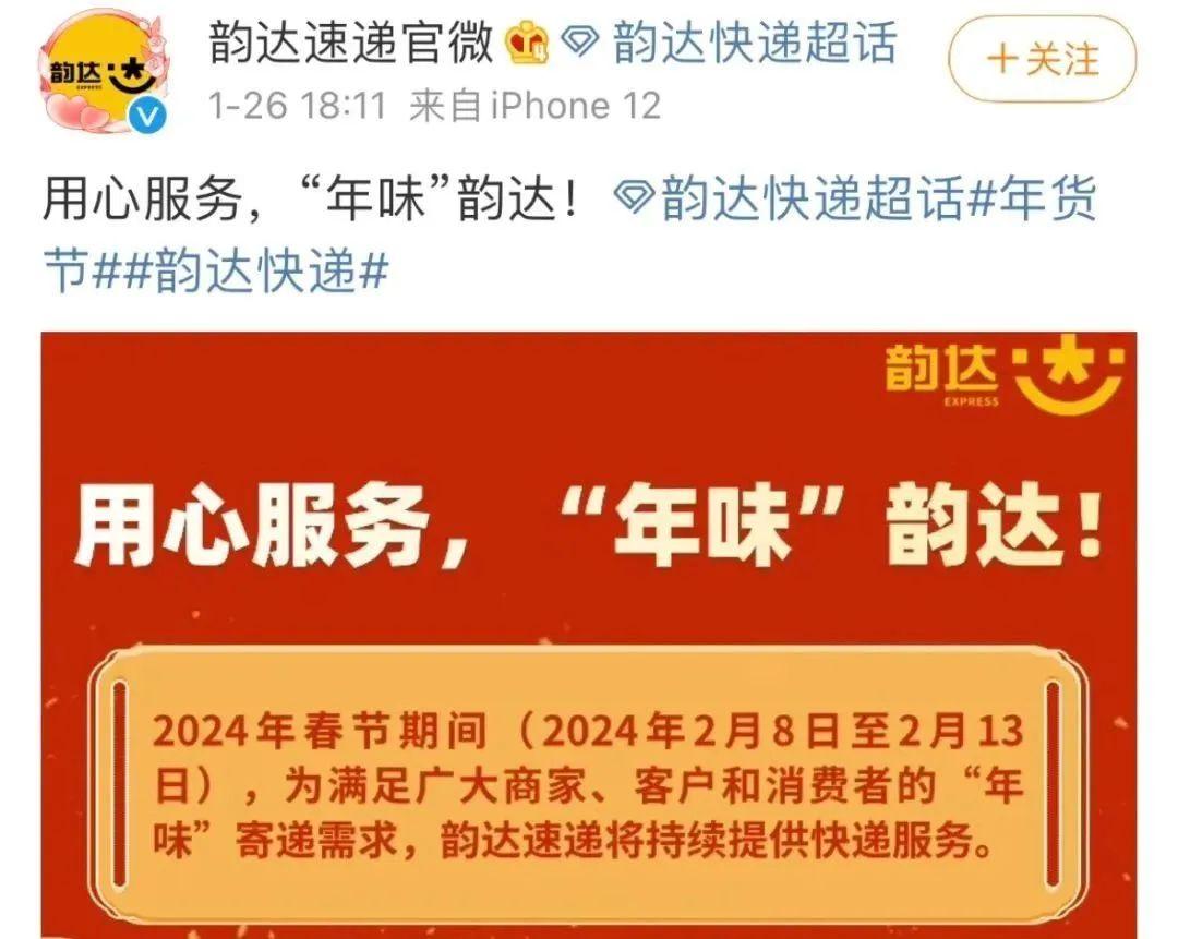 1月26日,“韻達速遞”官方微博發文,春節期間(2月8日至2月13日)韻達速遞將持續提供快遞服務。