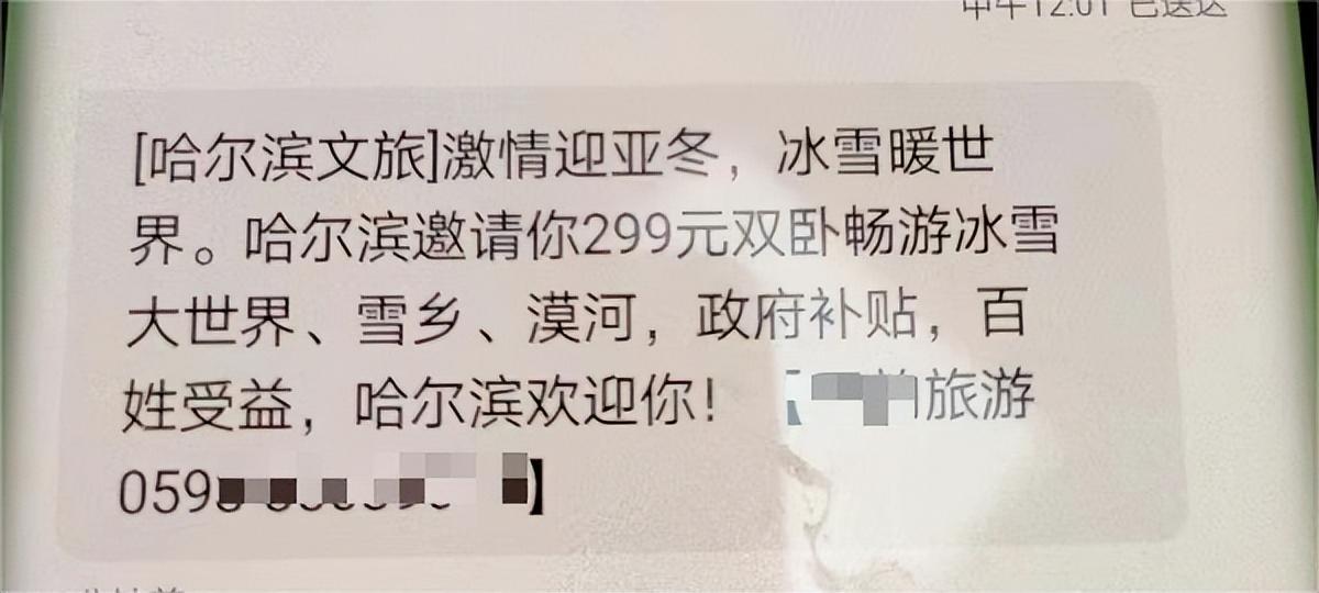 近日,在小郭母親王阿姨的手機上收到一條“299元雙臥暢遊冰雪大世界”的旅遊宣傳短信。因爲近期看了許多哈爾濱旅遊宣傳視頻,王阿姨頓時心動不已,感覺“撿到了大便宜”,準備撥打電話報名參加。